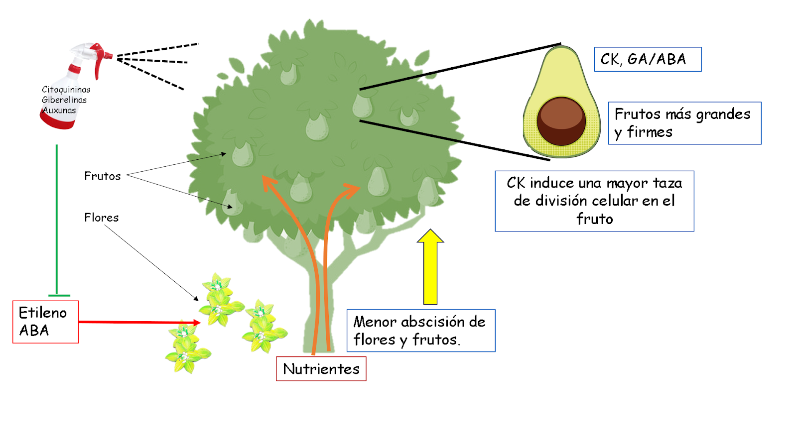 Se ha demostrado que la aplicación de hormonas vegetales en etapas estratégicas del cultivo puede mejorar la floración, el amarre de frutos y por tanto, el rendimiento. En un artículo anterior del foro: ¿Qué son las fitohormonas y cómo funcionan?, se menciona la función que cumplen estos biorreguladores en la planta. Estas hormonas regulan y controlan una amplia variedad de procesos de crecimiento y desarrollo. En el caso del aguacate, las fitohormonas son fundamentales para varios aspectos del ciclo de vida y la producción de la fruta. En el aguacate, las citoquininas pueden estimular la formación de brotes laterales, promover la floración y mejorar el cuajado de frutos. A continuación, se destacan algunas funciones adicionales de las citoquininas y su relevancia: