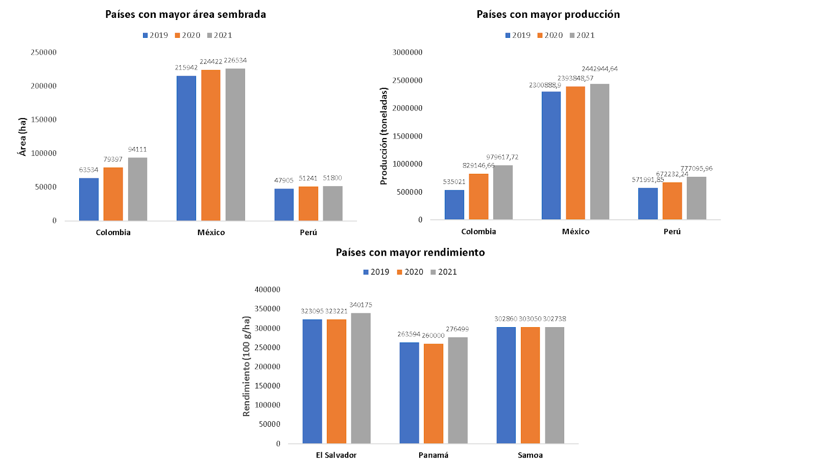 A nivel mundial los países con mayor área sembrada y producción son: México, Colombia, Perú, Indonesia, Chile, Sur África y EE. UU. Los países con mayor rendimiento en los últimos años son: El Salvador, Panamá y Samoa (figura 1). En Colombia, el cultivo ha crecido en área, producción y rendimiento en los últimos años, en el año 2020 se sembraron 79.832 hectáreas con una producción 889.866 toneladas y un rendimiento de 11,15 ton/ha. Actualmente los departamentos más representativos son Antioquia, Tolima, Caldas, Valle del Cauca y Santander [2].